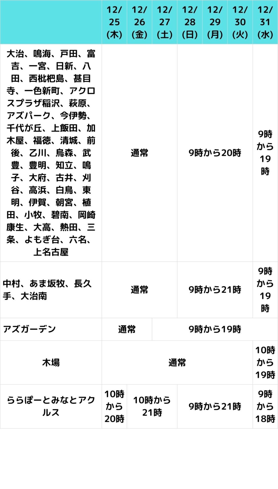 - 元日・1月2日に営業しているのは「アズパーク店」「ららぽーと名古屋みなとアクルス店」だけ